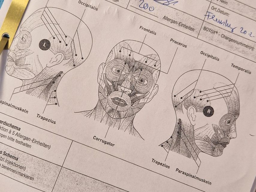Ich wurde sehr freundlich in der Klinik für Neurologie aufgenommen und bekam wider Erwarten schon beim ersten Kennenlernen mein Botox injiziert. Wichtig war mir die Gesamtversorgung im Gesicht, am Kopf und Hals bzw. Nacken. Bei negativem Stress steigt mir der Schmerz von hinten über den Trapezius nach oben und killt mich über diesen Umweg, während von der Stirn (durch Licht) nichts mehr getriggert wird. Auch der Bereich um die Ohren ist kritisch, v.a. das mehrfach operierte Goldstück. Die Narbe wirkt sich ungünstig auf meine Faszien aus.